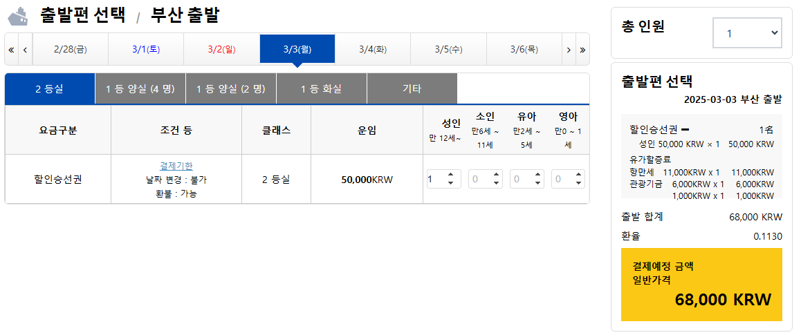 - 온라인 예약: 고려훼리 공식 홈페이지에서 출발 날짜와 객실 종류를 선택하여 예약을 진행합니다.