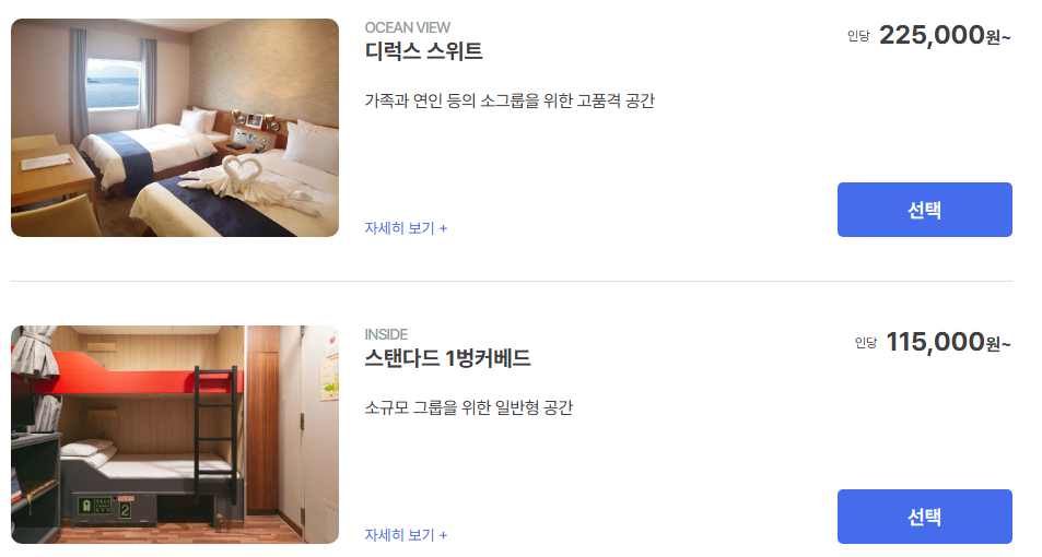 다음으로, 선호하시는 객실 타입을 선택해 주세요. 팬스타크루즈는 다양한 객실 옵션이 있으니, 예산과 취향에 맞게 고르실 수 있습니다.