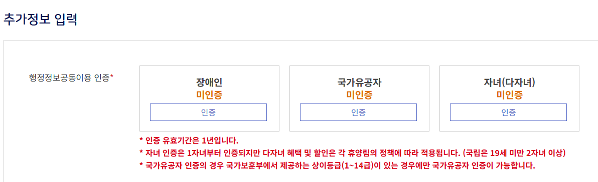 유의사항: 1가정당 1실에 한해 우선예약 신청이 가능하며, 입실 시 가족관계증명서 등 관련 서류를 지참해야 합니다.