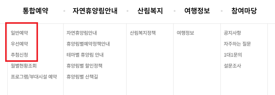 국립자연휴양림의 예약은 크게 일반예약, 우선예약, 추첨예약으로 구분됩니다.