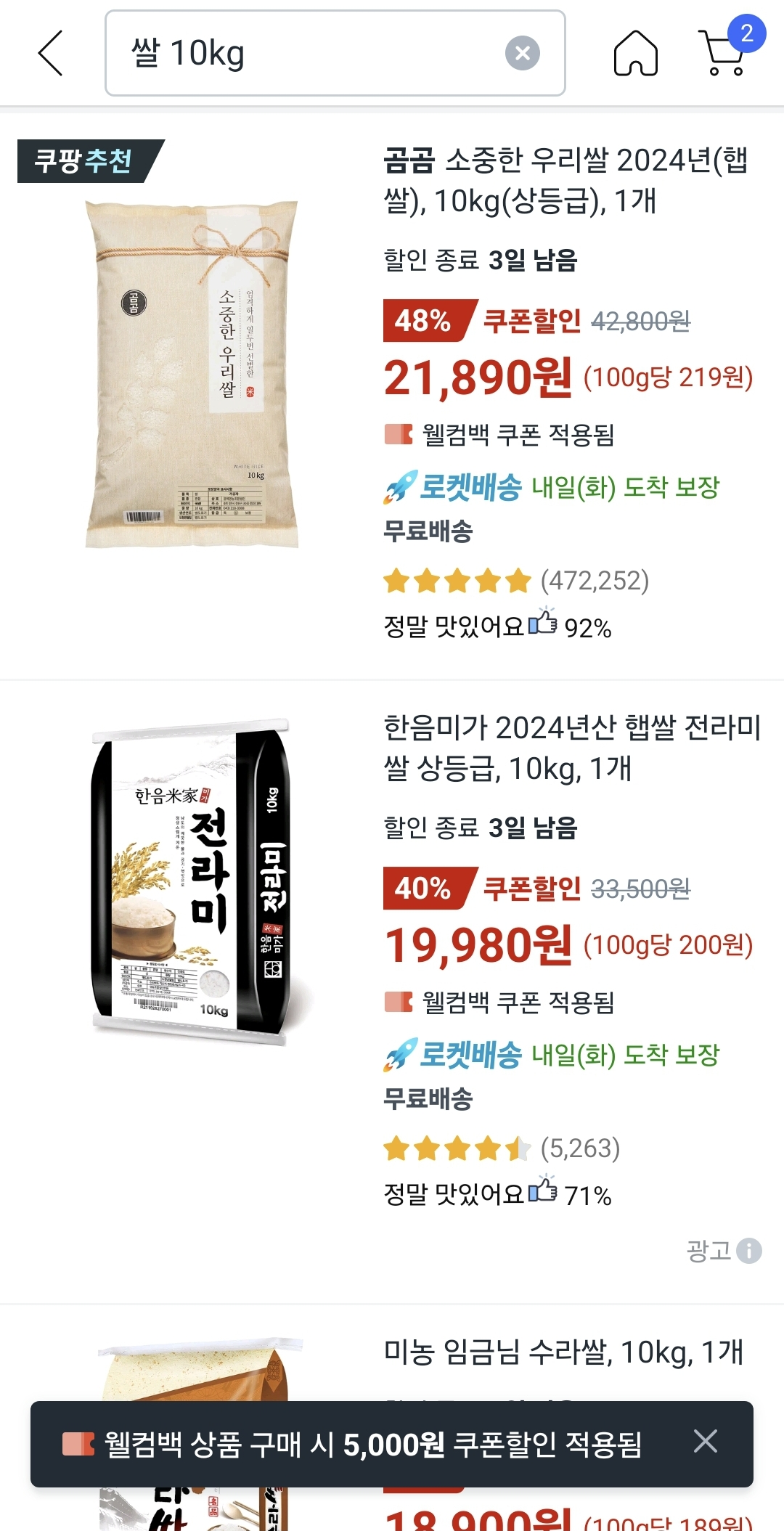 - 화면 상단의 돋보기 모양 아이콘을 눌러 예: '물티슈', '쌀' 등 원하는 상품명을 입력합니다.