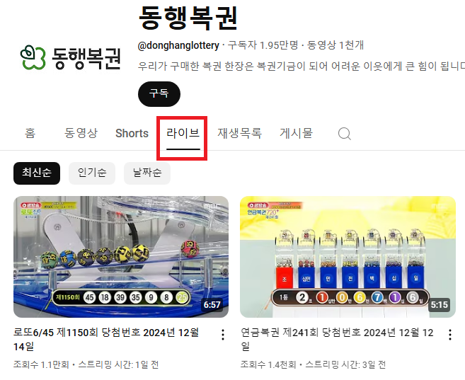 - 동행복권의 공식 유튜브 채널에서는 추첨 방송을 라이브 스트리밍으로 제공합니다.