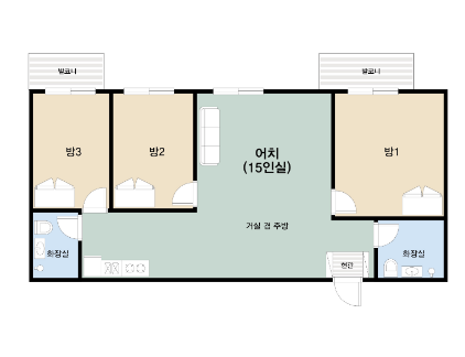 - 8 ~ 10인실: 거실 겸 주방 + 방1 + 화장실 + 발코니