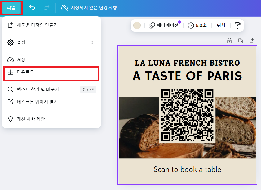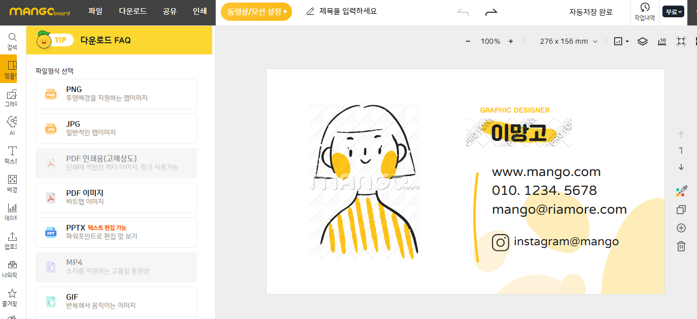 - 디자인 완료 후, 좌측 상단의 '다운로드' 버튼 클릭하여 원하는 형식(PNG, JPG, PDF)으로 저장.