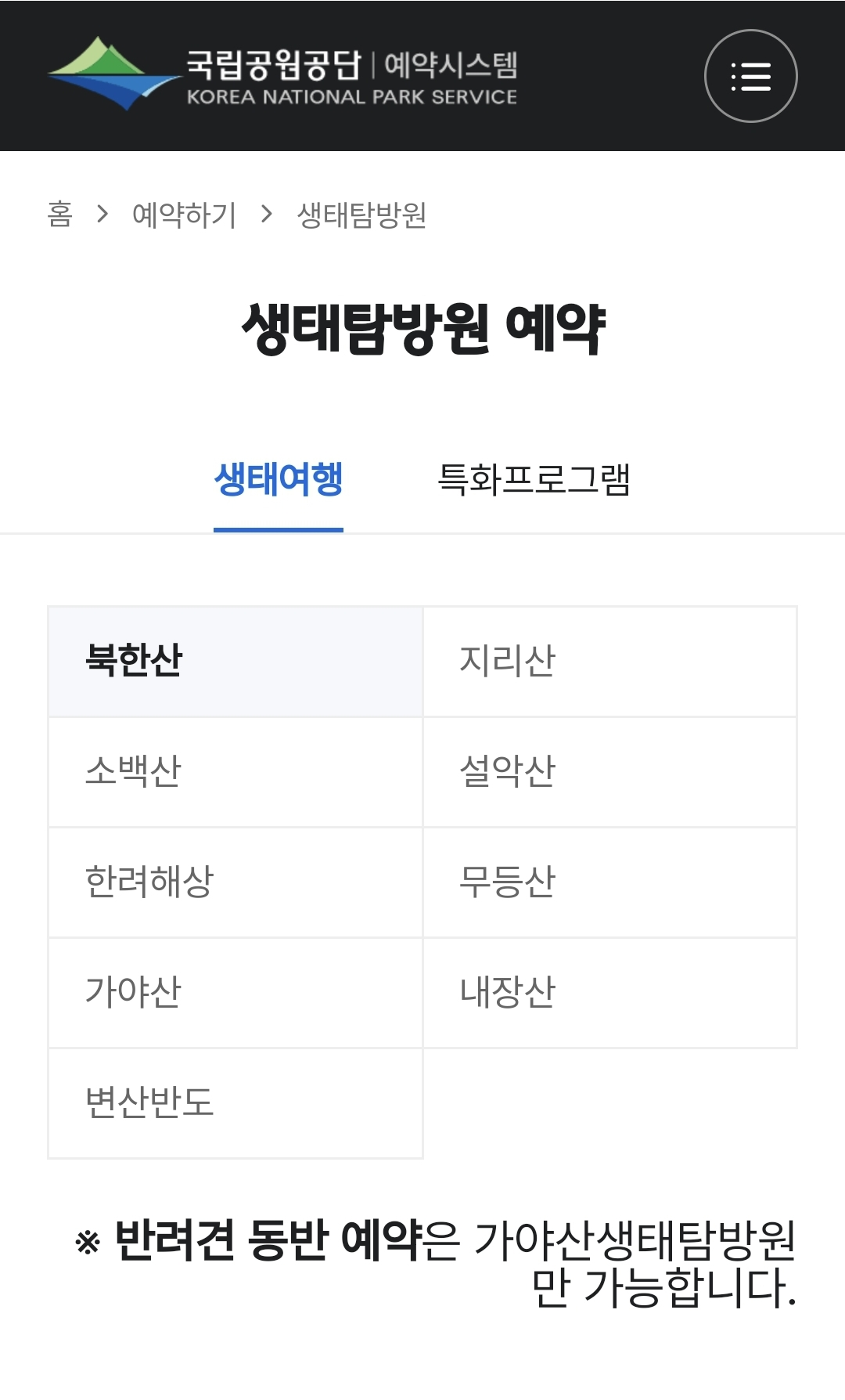 생태탐방원 예약을 위해서는 국립공원공단 예약시스템 홈페이지에 접속해야 합니다.
