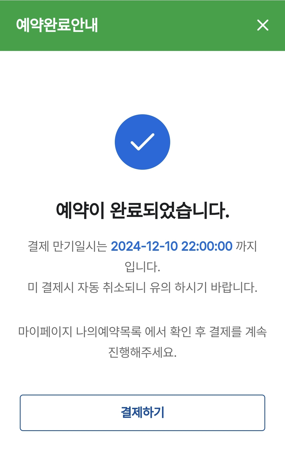 예약 내용이 확인되면 결제 버튼을 눌러 결제를 진행합니다. 만약 화면이 넘어가 결제를 완료하지 못한 경우, 우측 상단 메뉴(세 줄 아이콘) → 마이페이지 → 나의 예약 목록에서 다시 결제를 진행할 수 있습니다.