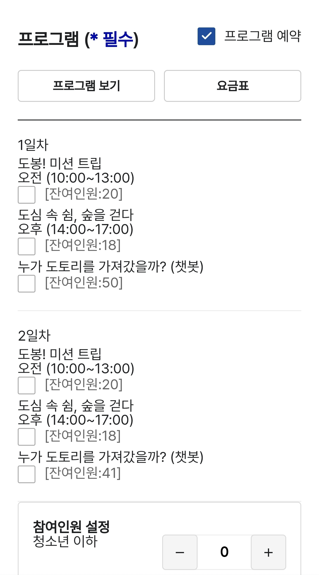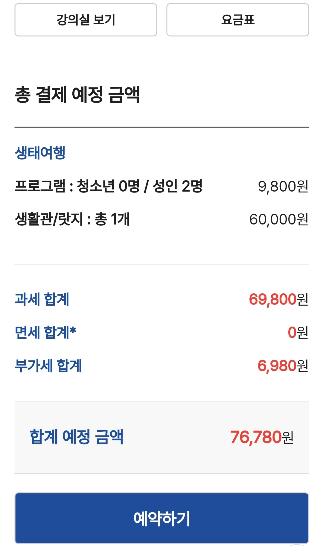 ※ 참고: 프로그램 예약은 2인 이상부터 가능하며, 생활관 이용도 함께 가능합니다.