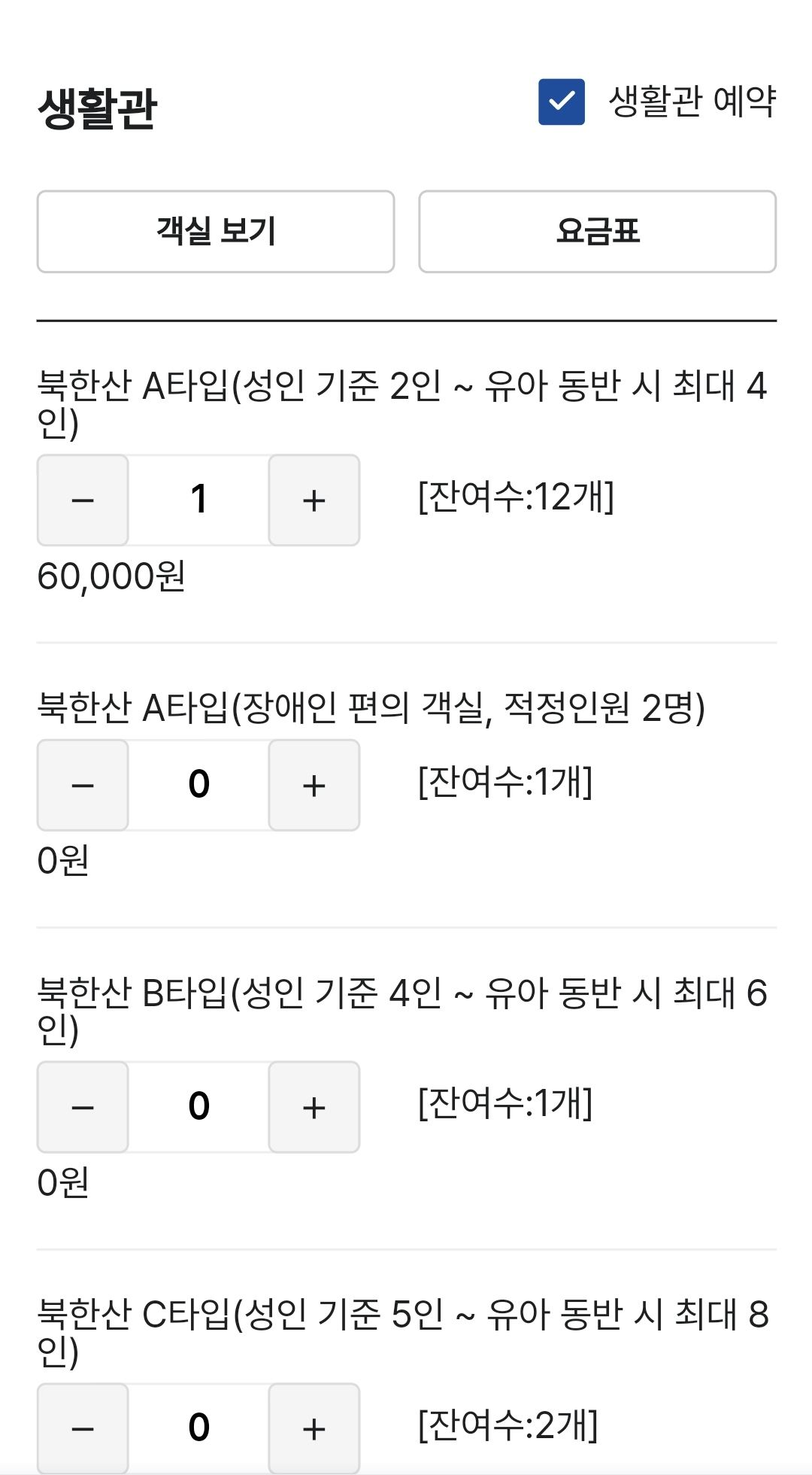 예약 가능한 프로그램과 생활관 중 원하는 옵션을 선택합니다.