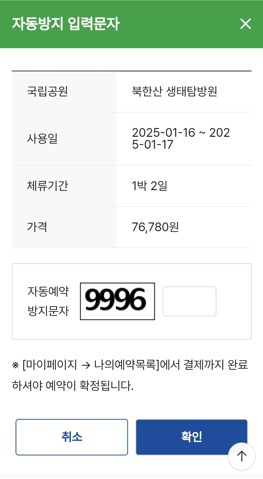 화면에 표시된 자동방지 입력문자를 입력한 뒤 ‘확인’을 눌러줍니다. - 결제 페이지로 이동