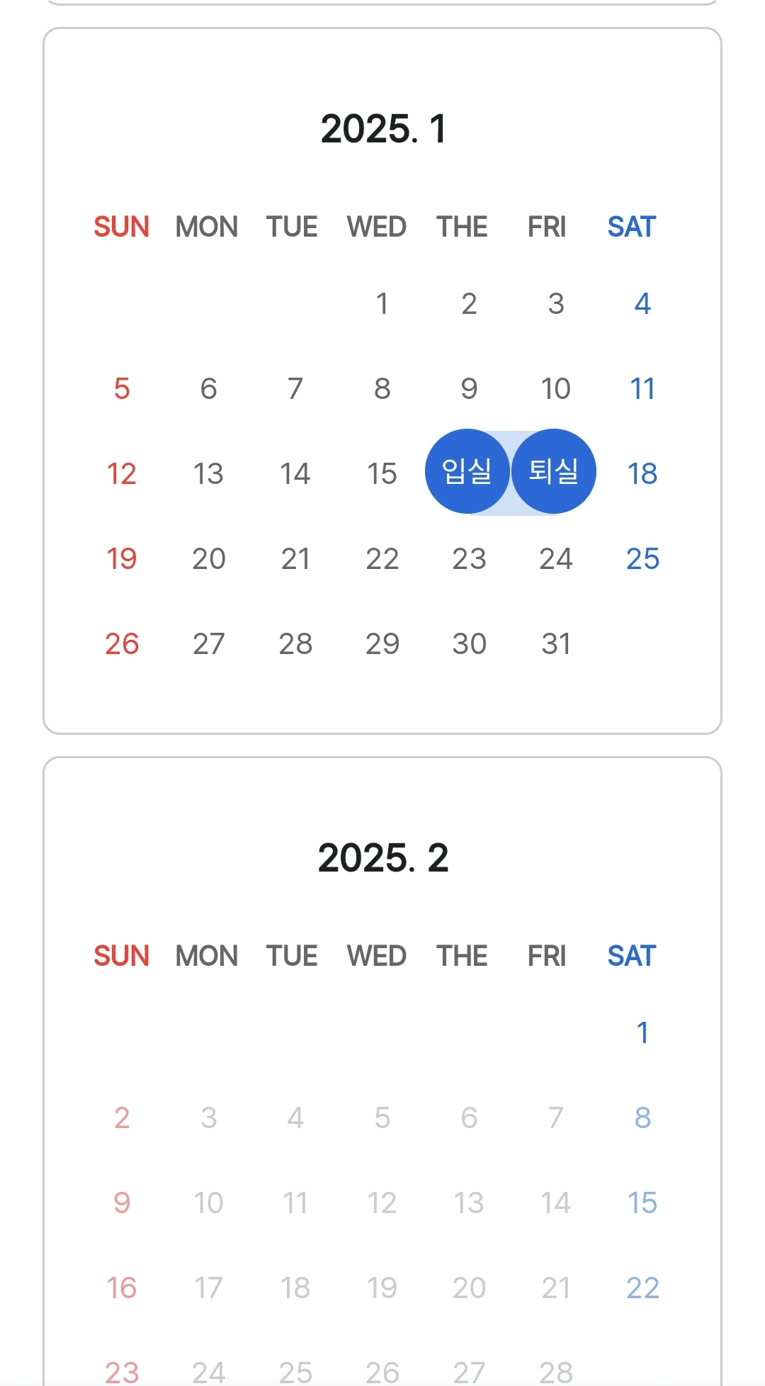 예약하고자 하는 입실 및 퇴실 날짜를 달력에서 선택합니다. 📅 원하는 일정에 맞게 체크하면 됩니다.