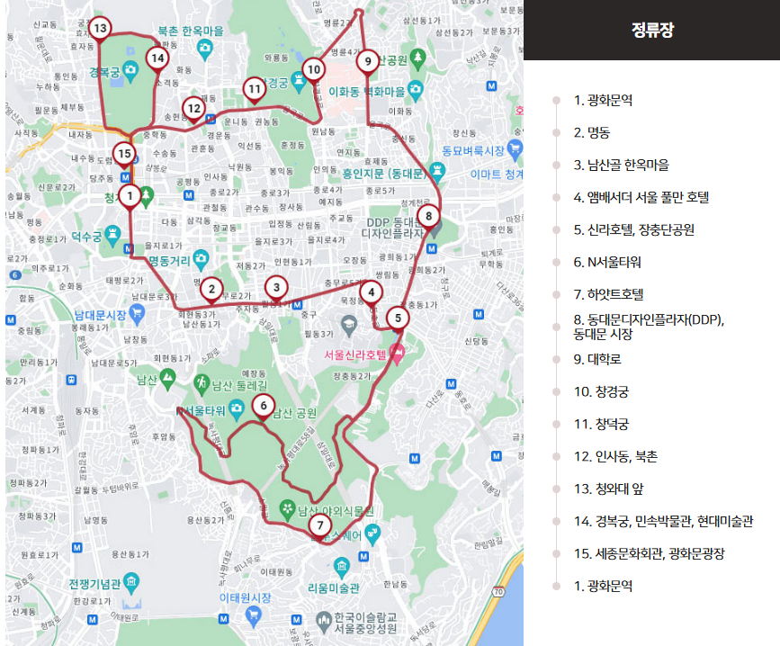 각 정류장은 관광지를 중심으로 설계되어 있어, 굳이 복잡한 지하철이나 택시 없이도 편하게 서울의 중심을 여행할 수 있습니다. 하루만에 서울의 매력을 효율적으로 느끼고 싶다면, 정류장마다 내렸다가 여유롭게 다시 탑승해보세요!