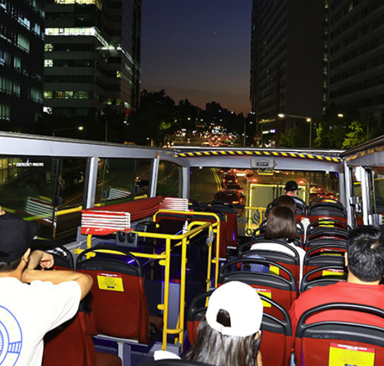 앞자리는 운전자 시점처럼 정면 서울 도심 뷰를 즐길 수 있어 인기 좌석입니다. 탑승 전 줄을 서거나 일찍 가는 것이 팁!