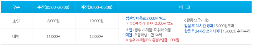 찜질방: 대인 15,000원, 소인 11,500원