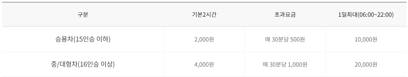 주차 : 10분당 200원(승용차), 10분당 400원(중형차-승합차), 10분당 600원(대형차-16인승 이상)