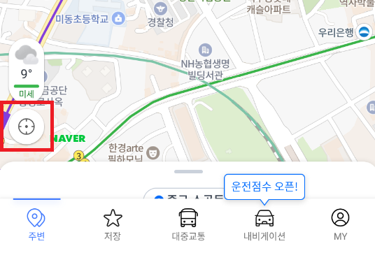 화면 하단의 현재 위치 버튼을 누르면 자신의 위치가 지도 위에 표시됩니다.