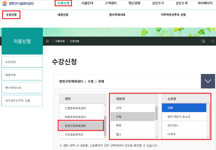 - 양천구시설관리공단 > 이용신청 > 수강신청 > 프로그램 선택