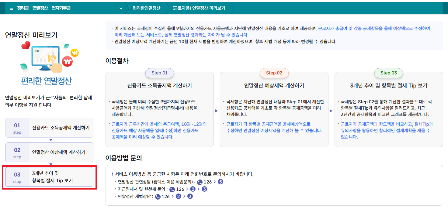 편리한 연말정산 > (근로자용) 연말정산 미리보기 > 3개년 추이 및 항목별 절세 Tip 보기