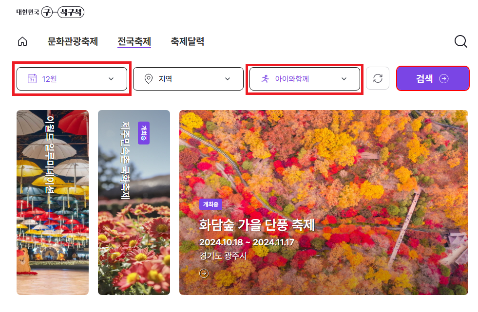 - 지역 : 특정 지역을 선택하거나, 모든 지역에서 열리는 축제를 검색할 수 있습니다.