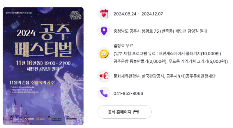 이처럼 1분이면 공주 페스티벌, 새해맞이 불꽃쇼, 평창 송어 축제, 양평 김장 보쌈 축제 등 다양한 축제 정보를 손쉽게 찾을 수 있습니다. 축제를 클릭하면 축제 기간, 위치, 비용, 연락처, 공식 홈페이지 등 상세 정보를 바로 확인할 수 있습니다.