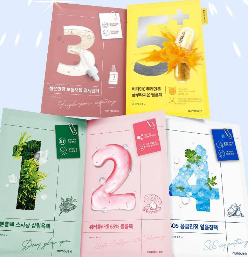 넘버즈인의 마스크팩 라인은 다양한 피부 고민에 맞춰 선택할 수 있도록 1번부터 5번까지 총 5가지 제품으로 구성되어 있습니다. 각 제품의 특징을 살펴보겠습니다.