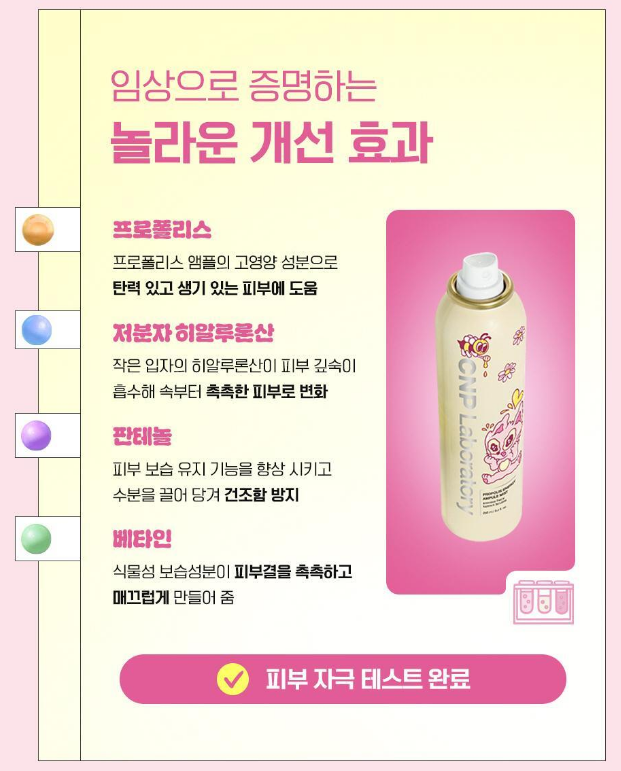 차앤박(CNP)의 '프로폴리스 앰플 미스트'는 벌집에서 추출한 프로폴리스 성분을 함유하여, 피부에 풍부한 영양과 수분을 공급하며, 건강한 윤기를 선사합니다.