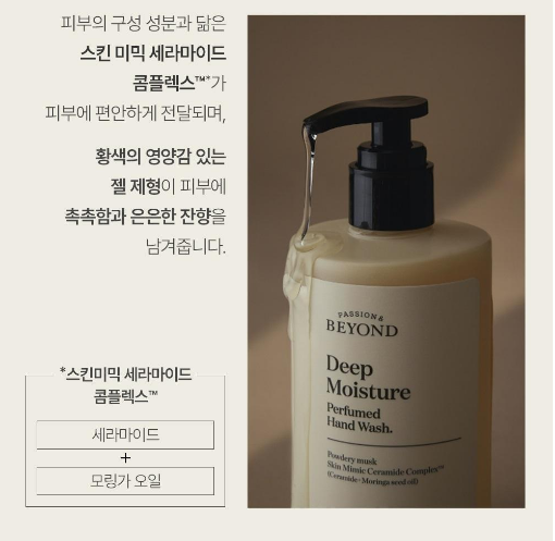 피부에 자극 없이 부드러운 세정과 함께, 향기롭고 감성적인 손 씻기 경험을 원하신다면 '비욘드 딥 모이스처 퍼퓸드 핸드워시'를 선택해보세요.