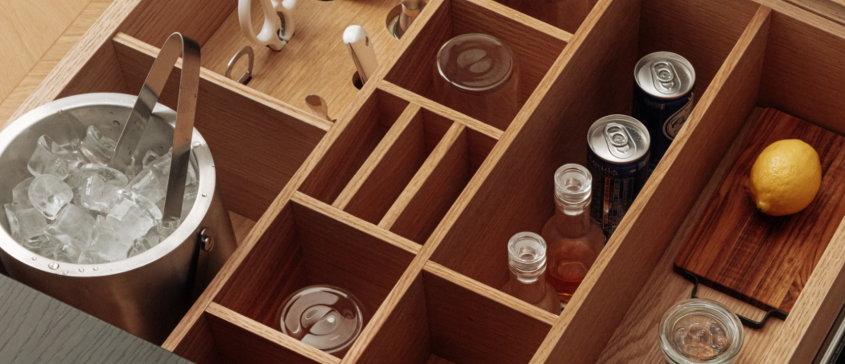 - 하이볼 테이블: 이 테이블 안에는 투숙객이 직접 하이볼을 만들어 즐길 수 있는 키트가 준비되어 있습니다. 제공되는 하이볼 키트는 매실과 얼그레이 두 가지 맛을 포함하고 있어, 취향에 따라 선택하여 맛보실 수 있습니다.