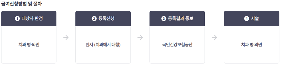- 지원 대상자 등록 신청 : 치과에서 ‘건강보험 치과 임플란트 대상자 등록 신청서’를 작성하여 보험공단에 제출