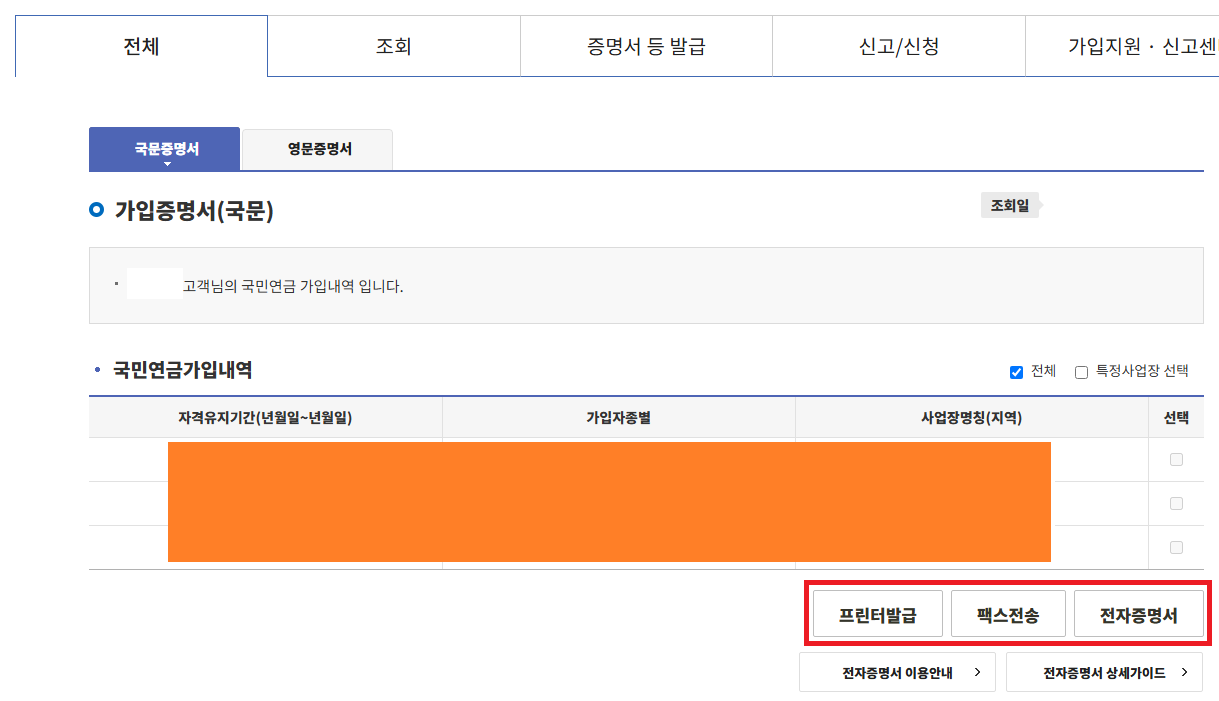 - 국민연금 가입증명서는 국문과 영문으로 발급이 가능하며, 프린터 출력 외에도 팩스 전송, 전자증명서 발급 등의 방법으로도 이용할 수 있습니다.