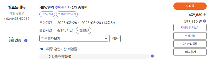 - HRD-Net에서 '주택관리사' 관련 국비지원 과정을 검색하여 원하는 교육기관과 과정을 선택합니다.