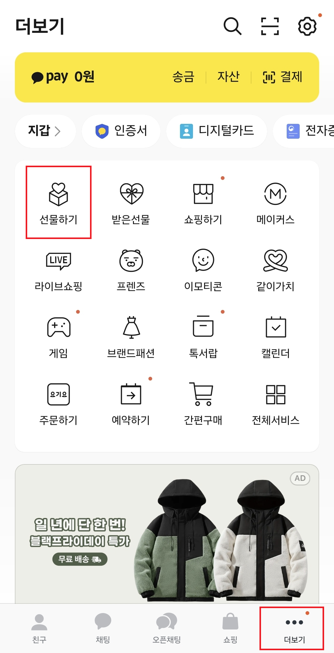 Step 1: 카카오톡 앱 실행 및 선물하기 메뉴 이동