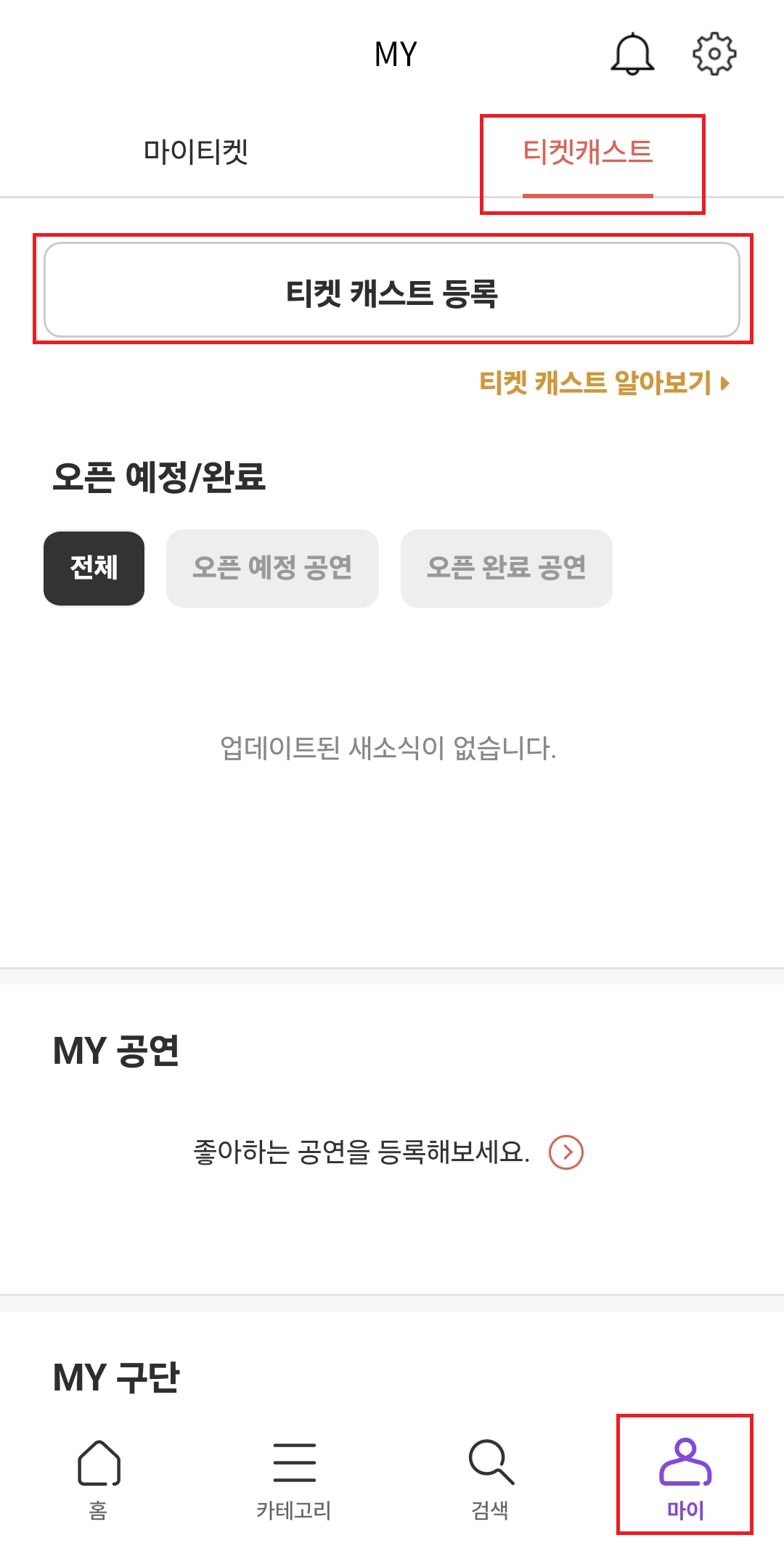 - 모바일 앱 : 하단에 있는 마이 메뉴에서 티켓캐스트 > 티켓 캐스트 등록을 선택합니다.