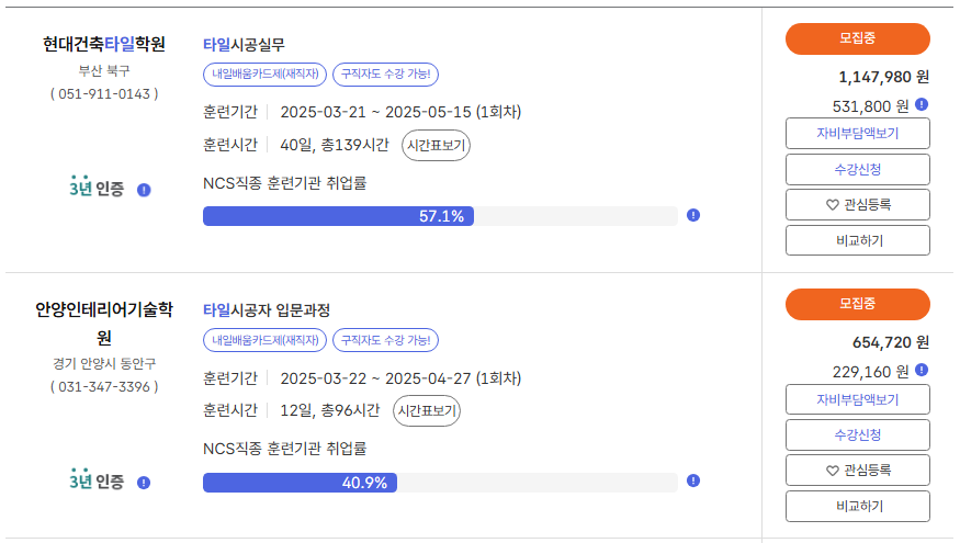 - 검색 결과에서 본인에게 적합한 훈련기관을 선택하고, 해당 기관의 수강신청 절차에 따라 등록합니다. 이때, 자비부담금 여부와 금액을 확인하는 것이 중요합니다.