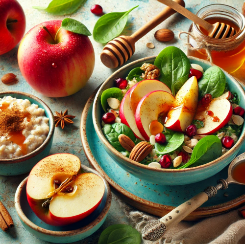 - 재료: 신선한 사과, 시금치 또는 로메인 상추, 견과류(호두 또는 아몬드), 건포도 또는 크랜베리, 올리브 오일, 레몬주스, 꿀