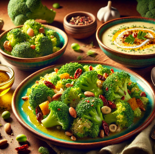 - 재료: 브로콜리, 다양한 채소(예: 시금치, 로메인 상추), 견과류(호두, 아몬드 등), 건과일(건포도, 크랜베리 등), 올리브 오일, 레몬 주스, 꿀