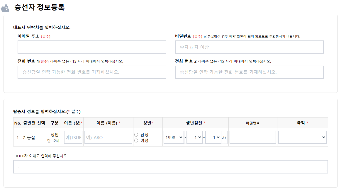- 승선자 정보 입력: 승선자의 이름, 이메일, 생년월일, 국적 등의 필수 정보를 입력합니다.