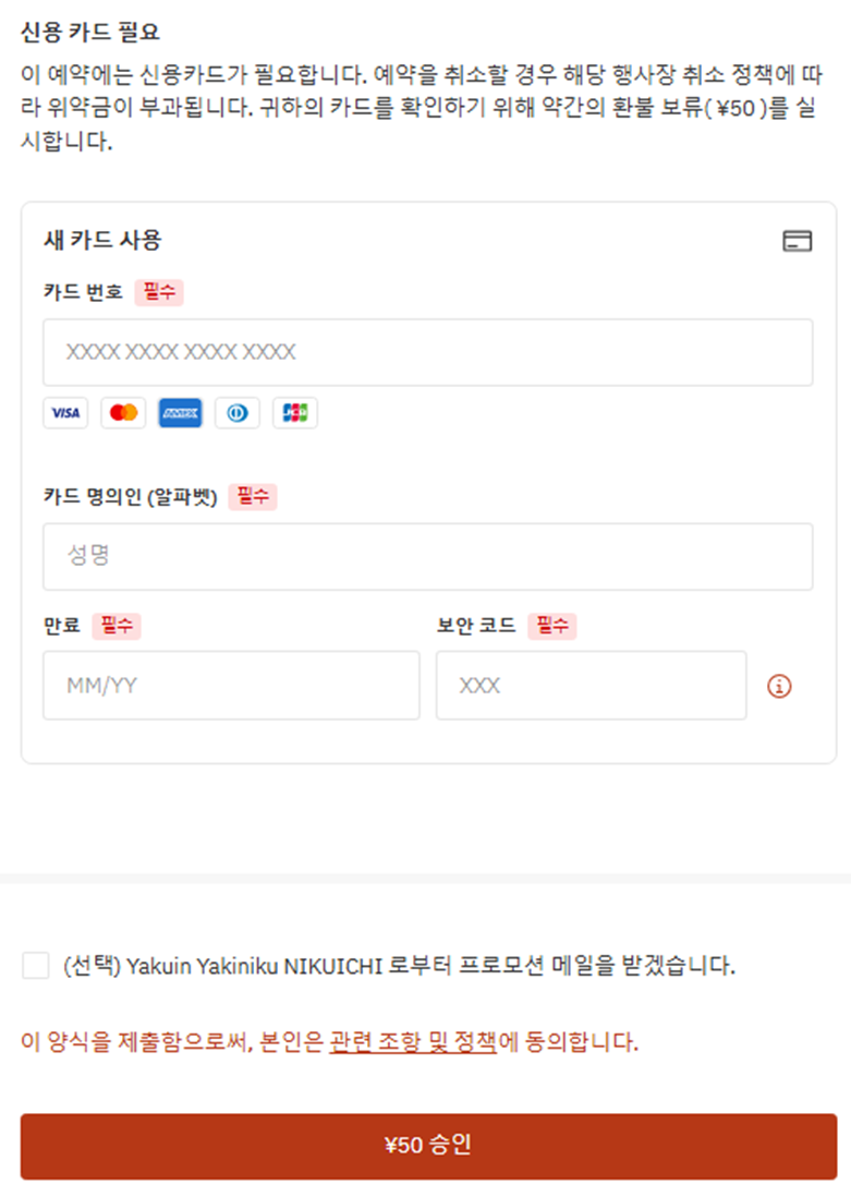 예약을 위해 신용카드 정보를 입력이 필요한데