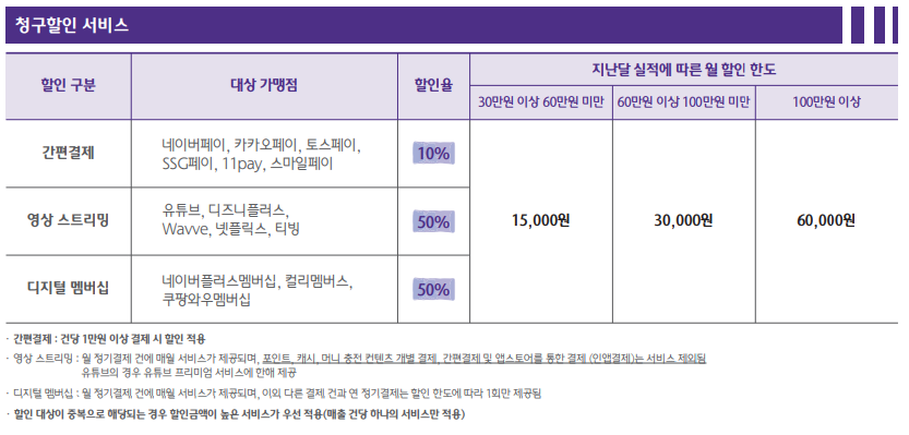 모든 혜택은 청구할인 방식이며, 전월 실적 기준 충족 시 제공됩니다. 다음 항목에서 실적별 한도를 확인할 수 있습니다.