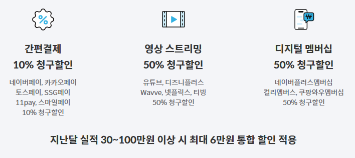 - 넷플릭스, 유튜브프리미엄, 디즈니플러스, 티빙, 웨이브 등 OTT 정기결제 시 50% 청구할인