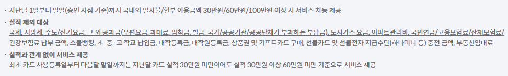 실적 제외 항목에 해당하는 결제는 누적금액에 포함되지 않으므로 사전 확인이 필요합니다. 구체적인 적용 기준은 카드사 약관을 참고하세요.